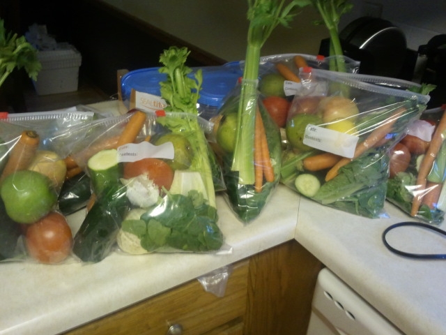 Juice for lunch and dinner: consists of romaine lettuce, spinach, zucchini, cucumber, celery, carrots, tomato, orange, apple (green and gala) and a pear